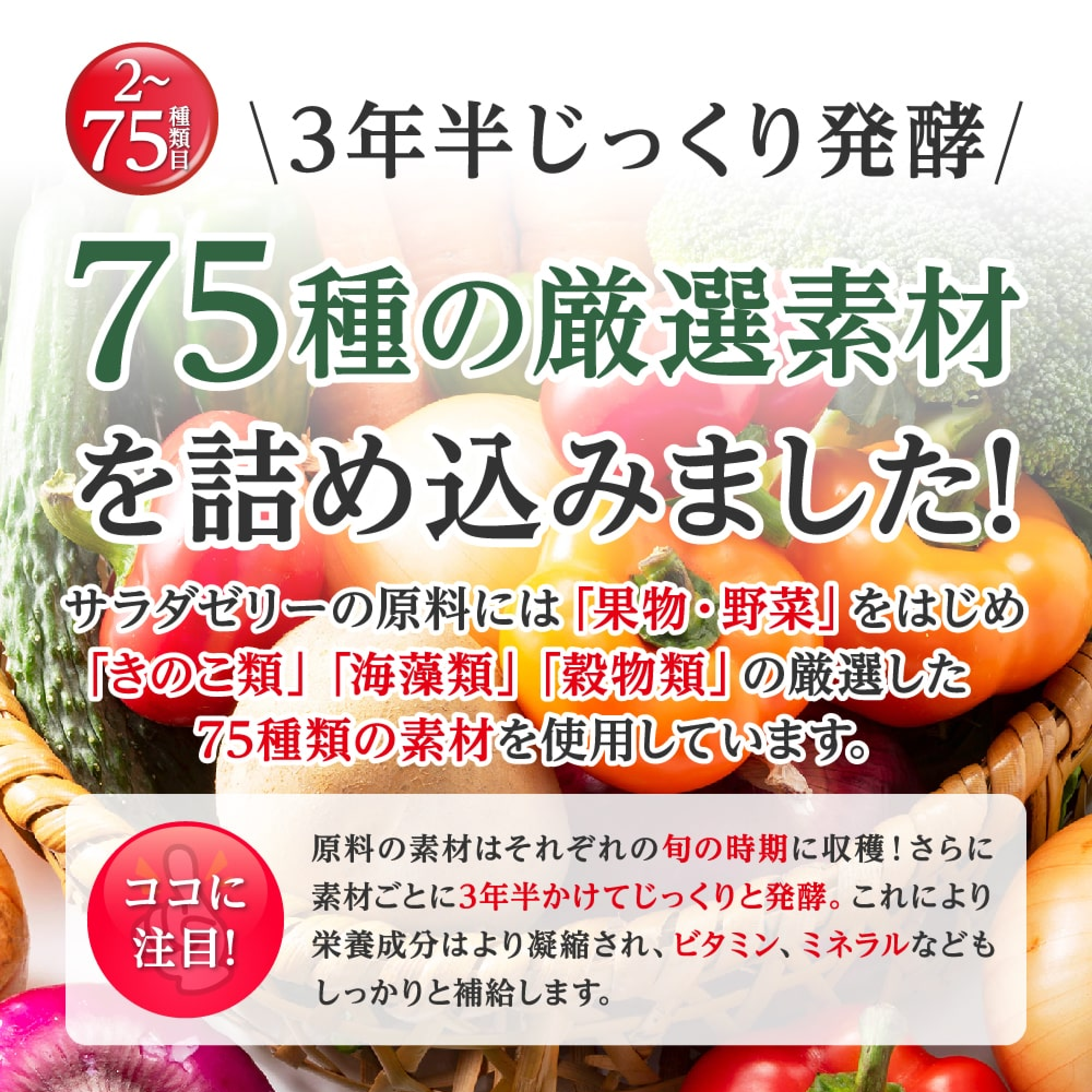 75種類以上の原料を厳選したフルーツ青汁の酵素乳酸菌サラダゼリー。