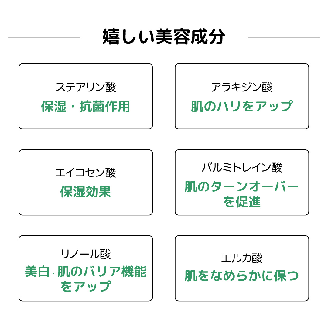 保湿や抗菌作用、肌のハリ、肌のターンオーバーを促進、美白・肌のバリア機能をアップ、肌をなめらかに保つなど、お肌にとってうれしい成分が豊富に含まれています。